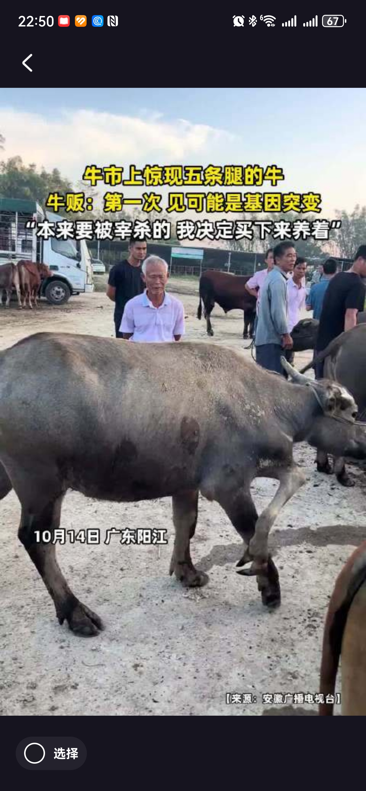 在广东阳江的一场牛市上,一头五条腿的牛引起了广泛关注。这头牛在左肩胛骨处长出了第五条腿,长约50厘米,但它并未影响牛的正常行走和健康。牛贩子表示,原本这头牛要被宰杀,但他决定花高价买下它进行养殖。专家分析指出,这是一例罕见的先天发育畸形现象。类似的情况也曾出现在四川巴中、贵州盘州等地。这头牛不仅在当地引起了轰动,还引发了人们对基因突变和动物畸形的关注。这种奇特的现象不仅展示了生命的多样性和奇妙之处,也为科学家提供了研究基因突变的宝贵素材。#牛跛腿# #五指牛# #五足牛#
